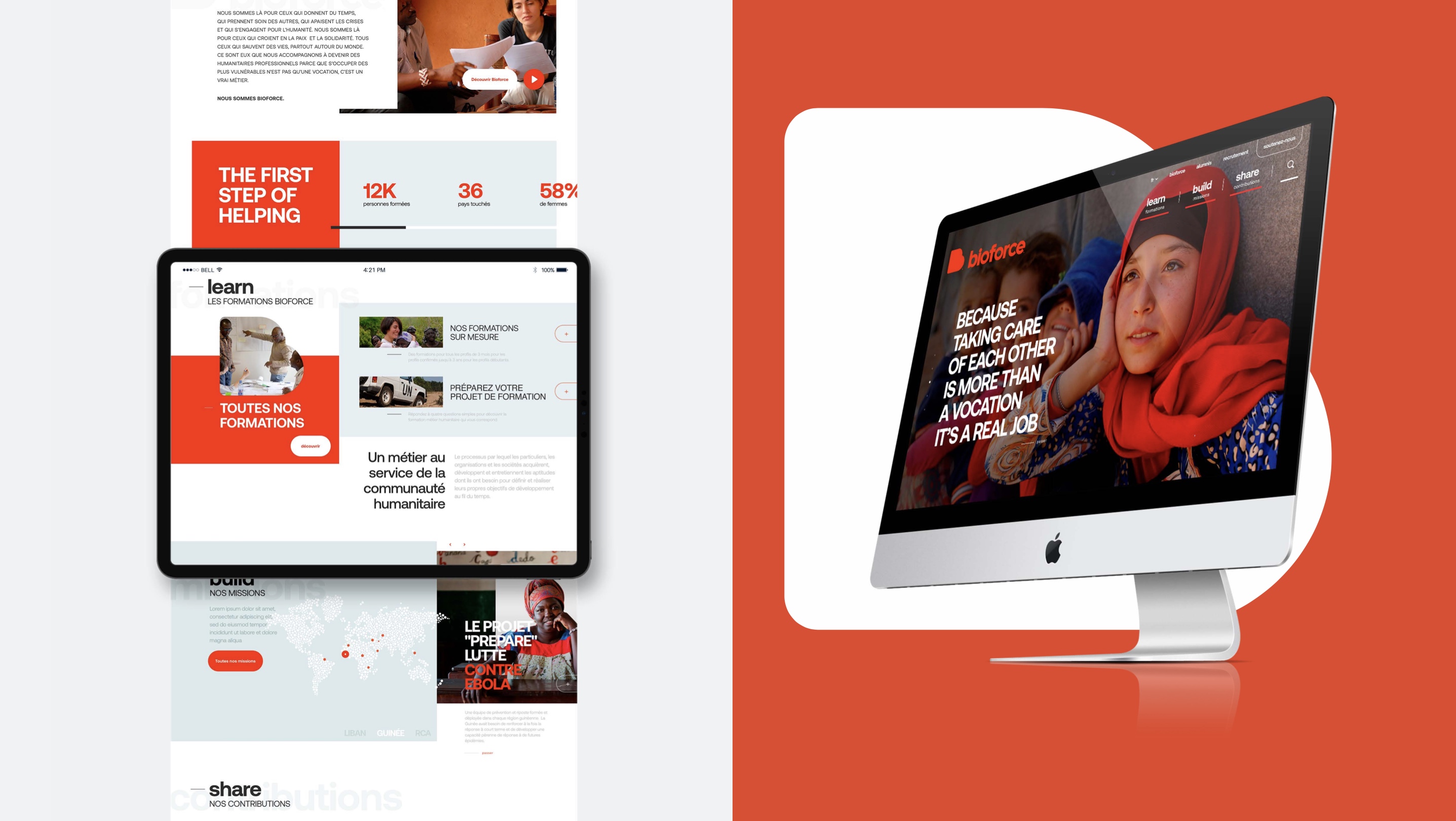 L'identité graphique de Bioforce avait au fil des années très peu évolué. Nous avons souhaité avec les équipes faire évoluer l'ensemble de l'expression d'un territoire très institutionnel à la version d'une structure beaucoup plus dynamique. Au premier lieu faire le choix d'une couleur visible et propriétaire au sein de ONG de terrains, le orange ...
